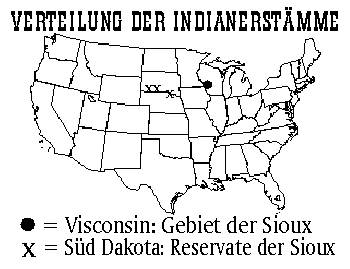 Während dieser Entwicklung splitterten sich die Sioux in zwei Gruppen: Die Östlichen Sioux, die sich wiederum in die Untergruppen Wahpetons, Wahpehutes, Moewakantons, Sissetons, Yanktons und Yanktonais aufteilten und in Minnesota als Ackerbauern lebten, und die Westlichen Sioux, den Brulés, Hunkpapas, Blackfoot, Miniconjous, Oglallas, Sans Arcs und Two Kettles, die jenseits des Mississippi als Büffeljäger ihren Lebens- unterhalt verdienten. Die zuletzt genannten verstärkten noch ihre Macht und vergrößerten ihr Jagdgebiet, indem sie gegen schwächere Stämme Krieg führten. Gegen 1850 be- herrschten 15000 Sioux-Krieger die Prärie und verbreiteten Angst und Schrecken.